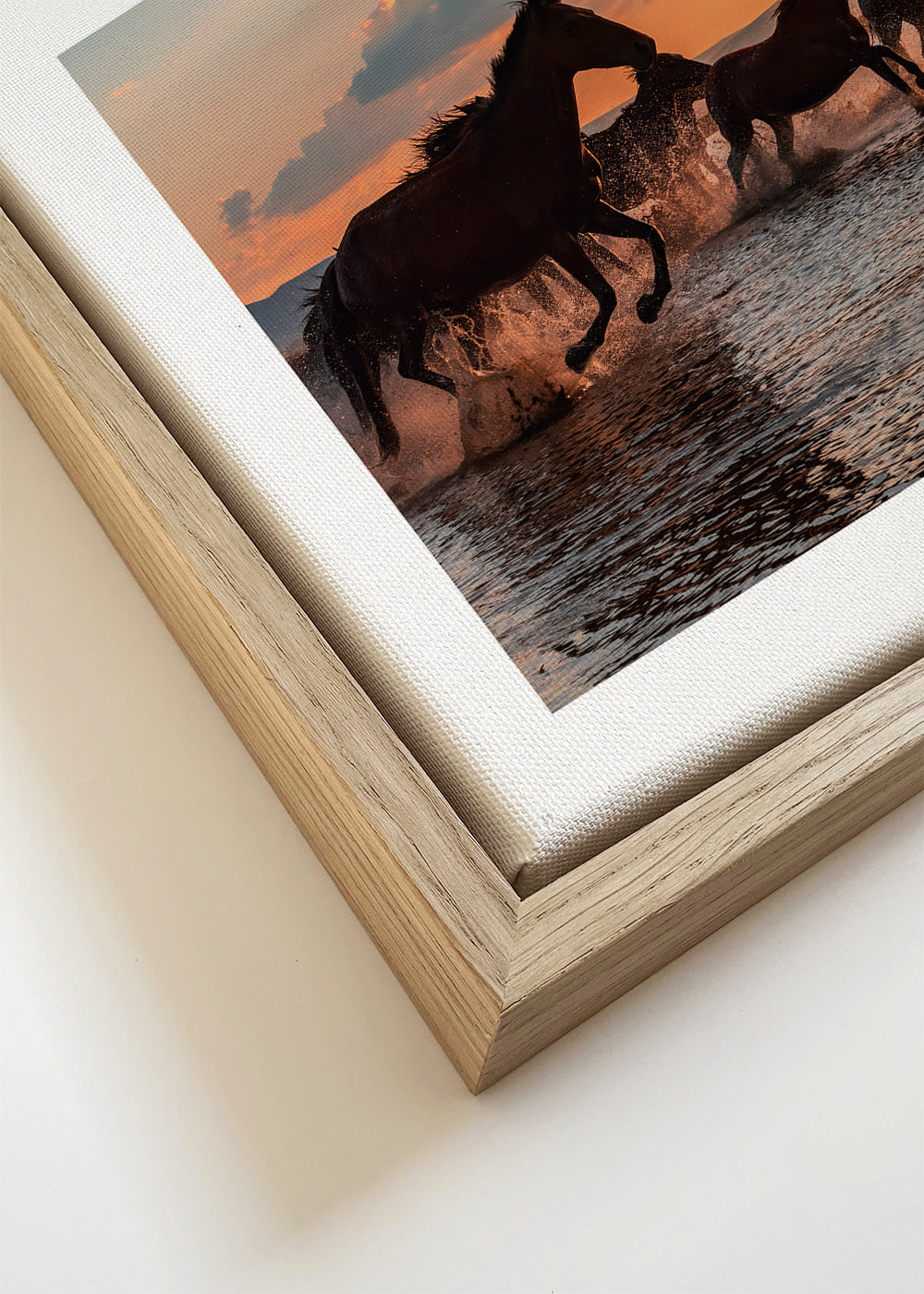 Wenn Sie die Passepartout-Option wählen, fügen wir die weiße matte Platte dem Rahmen hinzu und reduzieren das Design der Arbeit. Wählen Sie beispielsweise ein Druckformat 50x70 cm, mit eichenfarbenem Rahmen und Passepartout, reduzieren wir das Design des Druckes auf das bisherige Format (40x50cm). So passt es sich perfekt an das Innenfenster des Passepartouts an.
