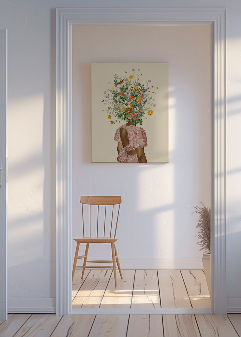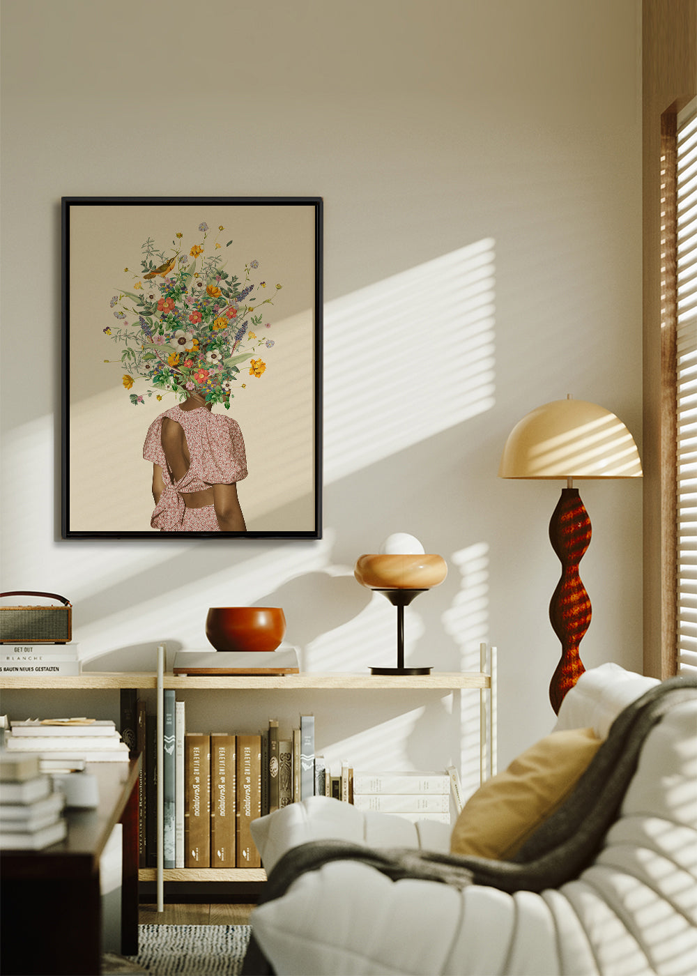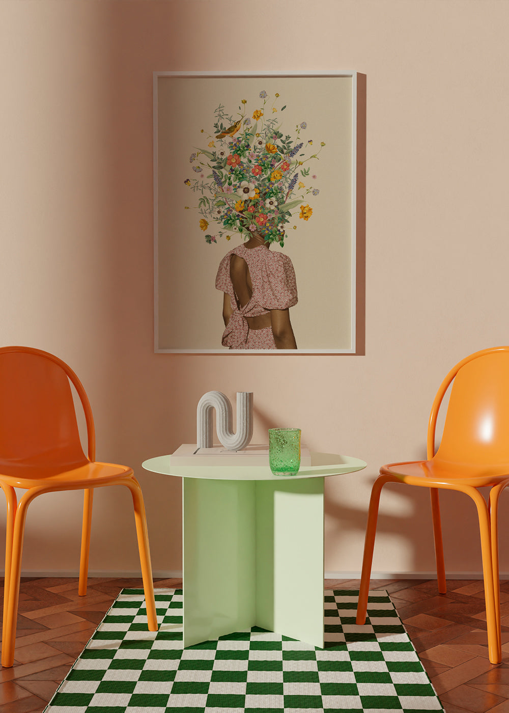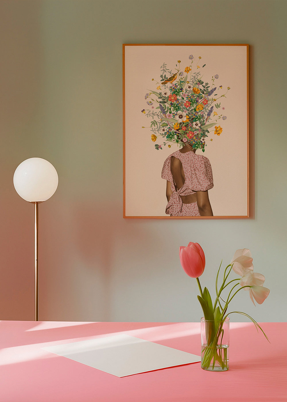 Ein Design aus unserer Auswahl an Frauengemälden von Frida Floral Studio, mit Grüntönen und zum Aufhängen in vertikaler Position. Ein Werk im Retro-Stil, ideal für eine Dekoration mit Vintage-Akzenten. Wände voller Kreativität.